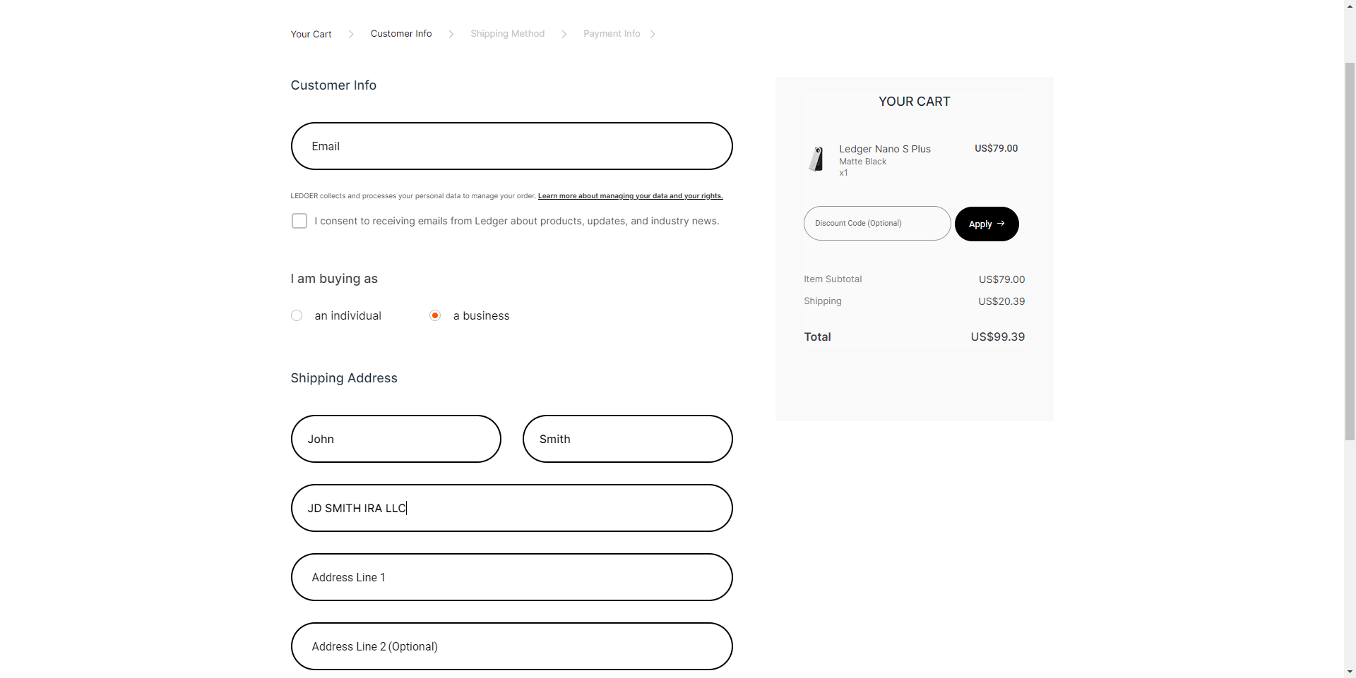 If you are purchasing a hardware wallet, you can request a debit card from our partner bank. Ledger allows a business name to be listed when purchasing. You can use list your Checkbook IRA or Solo 401(k) trust name here.